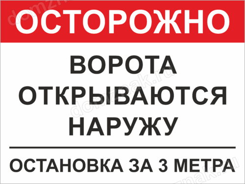 Автоматические ворота могут стать источником аварии или опасного происшествия. Предупредить водителей об особенностях работы ворот можно с помощью таблички «Осторожно, ворота открываются наружу». Расстояние до места остановки, дизайн и цветовая гамма меняются в зависимости от пожеланий заказчика.
