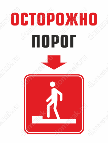 Чтобы войти в ваш магазин или заведение нужно переступить порог? С помощью таблички «Осторожно, порог» вы предупредите клиентов о препятствии и уменьшите вероятность их спотыкания и падения. На ее белом фоне размещена предупреждающая надпись и пиктограмма, которая усиливает послание.