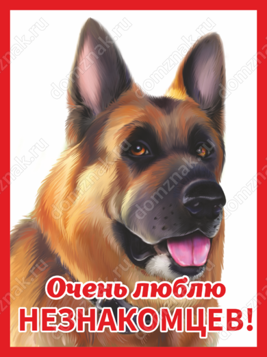 Табличка «Очень люблю незнакомцев» немецкая овчарка изготавливается на основе из пластика ПВХ или оцинкованного металла.
