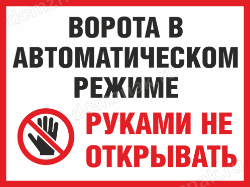 Табличка «Ворота в автоматическом режиме, руками не открывать» изготавливается на основе из пластика ПВХ или оцинкованного металла.