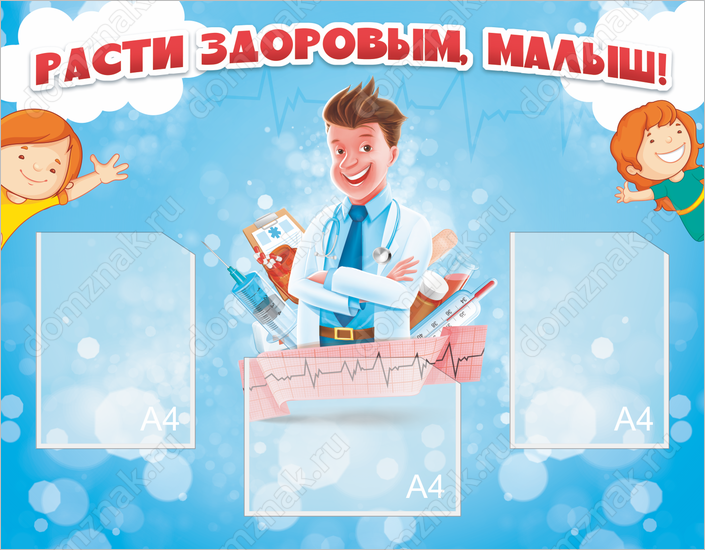 Стенд для медкабинета «Расти здоровым малыш» поможет донести до родителей маленьких детей необходимую информацию, касающуюся здоровья их чад. Он украшен контрастным заголовком и качественными детскими рисунками. Для размещения информационных материалов на нем предусмотрено 3 пластиковых кармана вертикального и горизонтального формата. Оборудуйте таким стендом учреждение здравоохранения, медицинский кабинет в школе или детском саду.