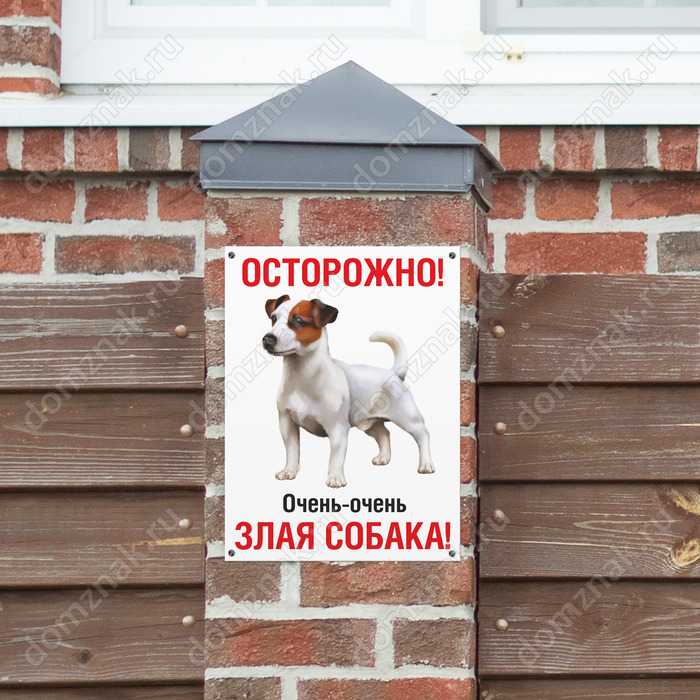 Табличка «Очень злая собака» джек-рассел-терьер изготавливается на основе из пластика ПВХ или оцинкованного металла.