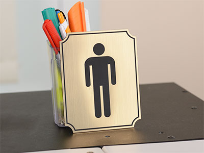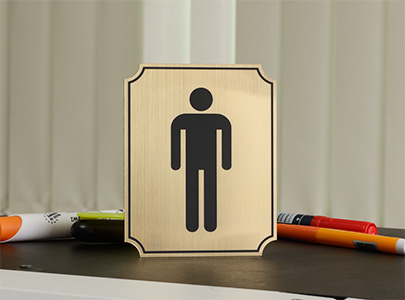 • Табличка туалет мужской (женский) изготавливается из двухслойного пластика, толщиной 1,6 миллиметра. Пластик состоит из двух слоев: основы черного (или белого) цвета и лицевого слоя контрастного цвета.