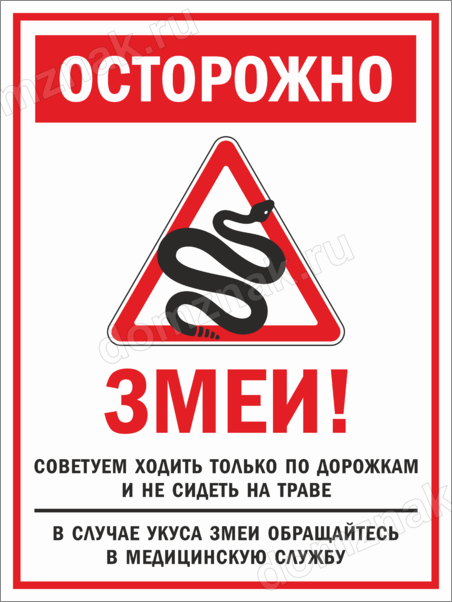 Табличка «Осторожно, змеи!» изготавливается на основе из пластика ПВХ или оцинкованного металла.