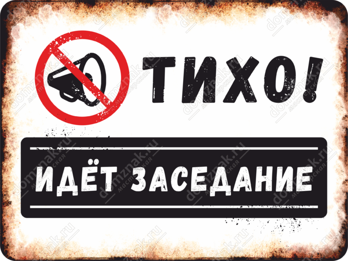 Сувенирная табличка «Тихо! Идет заседание» функциональна и практична. В дизайне используются элементы стиля советской эпохи – перечеркнутый рупор, шрифт, состаренный фон с налетом легкой ржавчины. Стилизованную табличку можно использовать в офисе, отметив ею переговорную комнату, или в качестве декора в интерьере дома или квартиры.