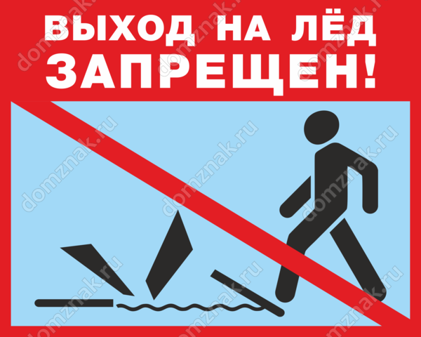 Табличка «Выход на лёд запрещен» изготавливается на основе из пластика ПВХ или оцинкованного металла.
