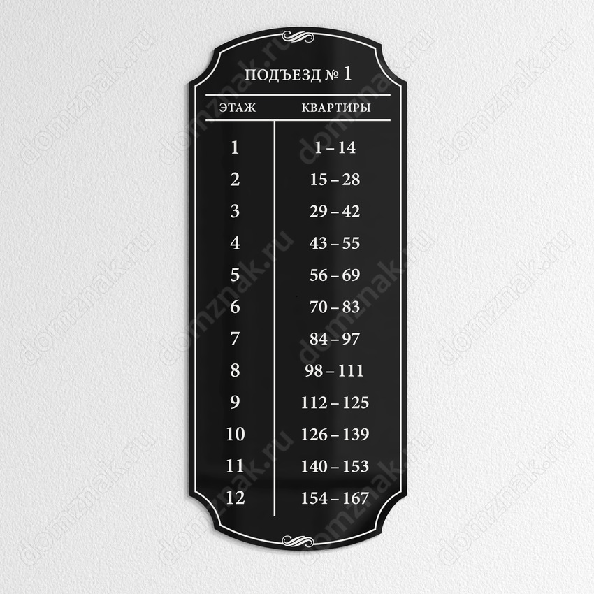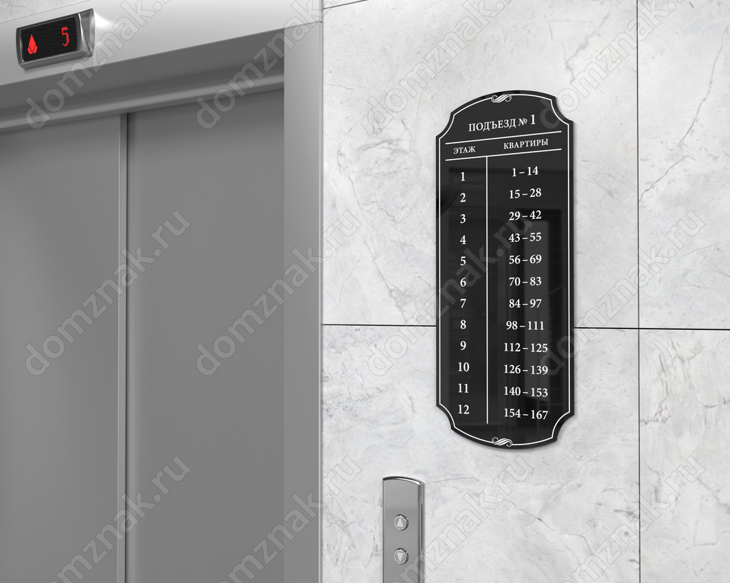 Элегантная и стильная табличка "Этажная навигация" содержит поэтажную схему расположения квартир в многоквартирном доме. Разместите табличку на первом этаже у входа или лифта, чтобы гости могли сориентироваться, какой этаж им нужен.