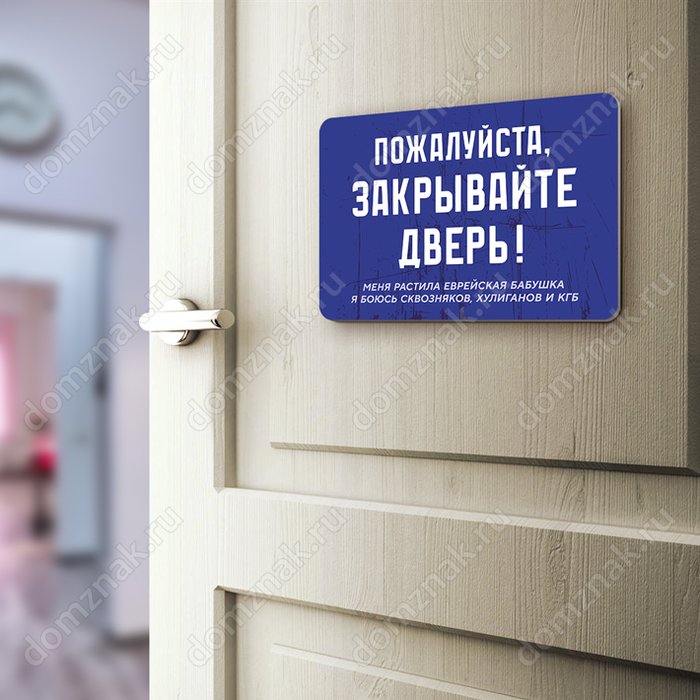 Табличка «Пожалуйста, закрывайте дверь. Меня растила еврейская бабушка я боюсь сквозняков, хулиганов и КГБ» изготовлена из пластика ПВХ, толщиной 4 мм. Изображение наносится по технологии УФ-печати. Табличка предназначена для использования как в помещении, так и на улице.