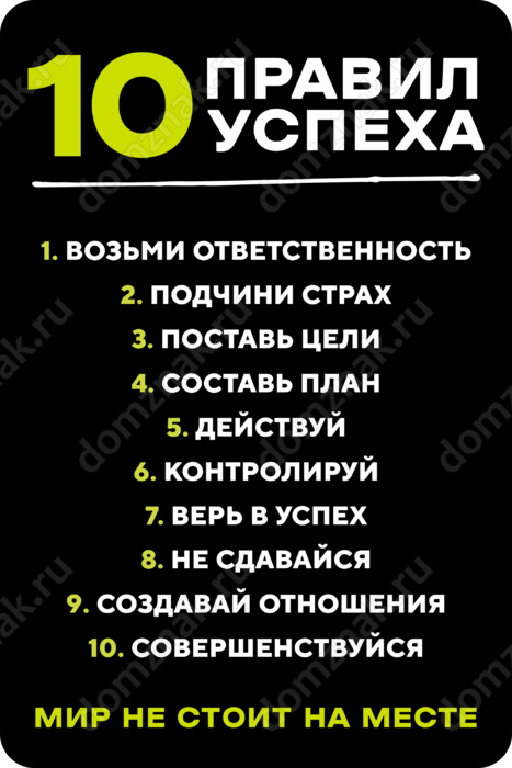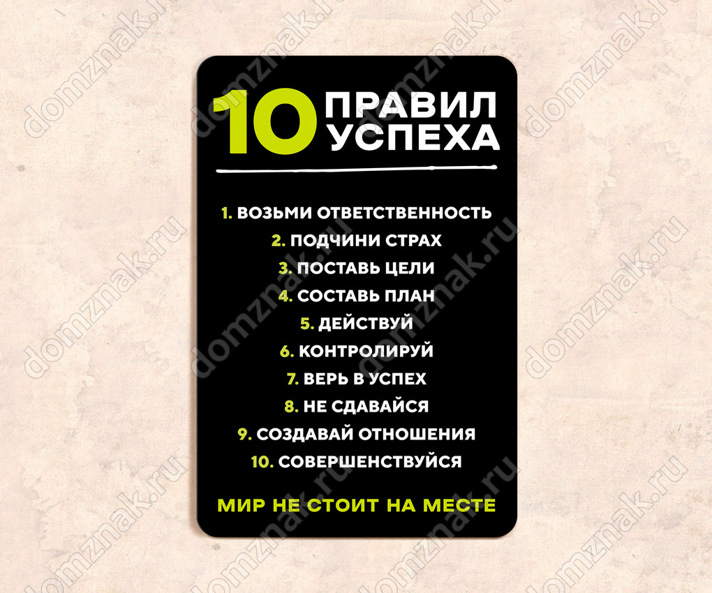 Табличка «10 правил успеха» изготовлена из пластика ПВХ, толщиной 4 мм. Изображение наносится по технологии УФ-печати. Табличка предназначена для использования как в помещении, так и на улице.