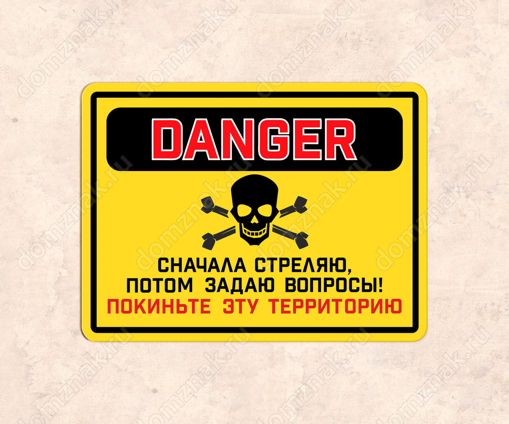 Табличка «Сначала стреляю, потом задаю вопросы! Покиньте эту территорию»