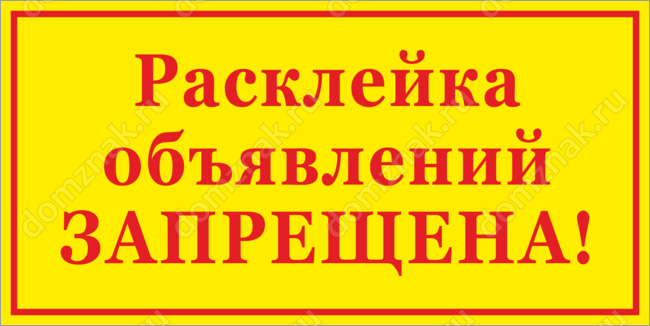 Табличка «Расклейка объявлений запрещена» напоминает рекламным агентам о том, что двери и стены подъезда не имеют ничего общего с доской объявлений. Яркое сочетание желтого фона и насыщенных бордовых букв привлекает внимание, а лаконичность формы подчеркивает официальный тон обращения.