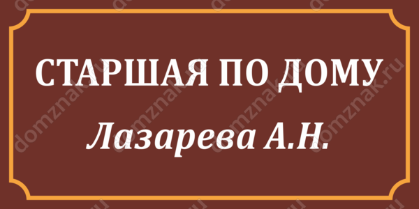 Информационная табличка «Старший по дому» необходима в любом доме, где жильцы заинтересованы в чистоте и порядке. Мы предлагаем изготовить такую табличку в теплых шоколадно-оранжевых тонах, по желанию клиента возможен выбор любой цветовой гаммы.